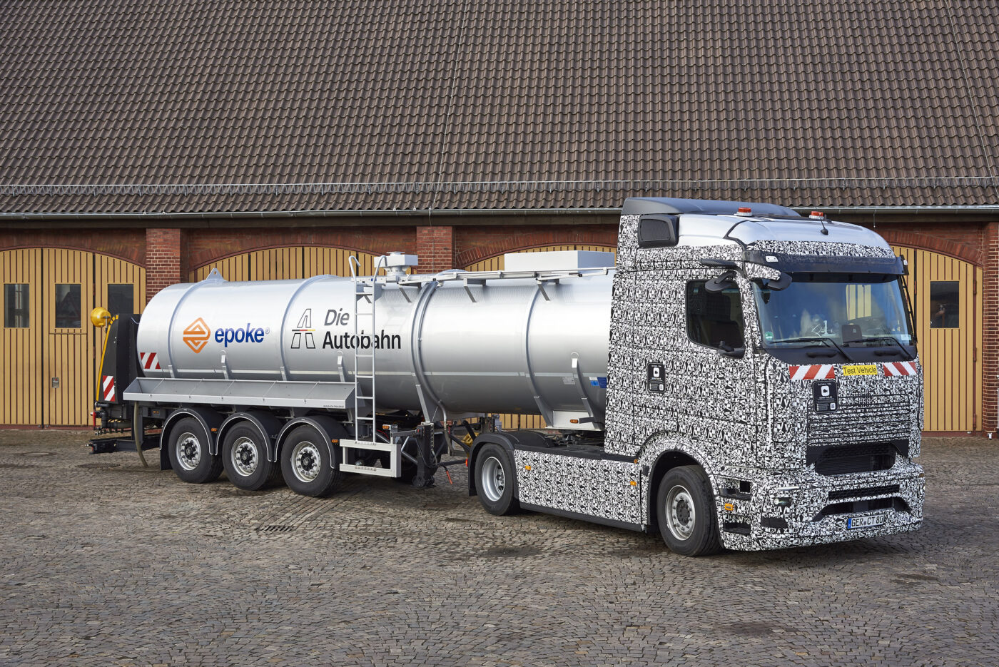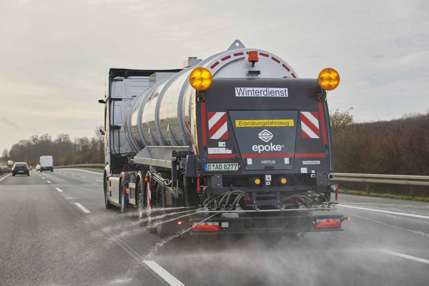 Mercedes-Benz Trucks und die Autobahn GmbH des Bundes haben Anfang Februar gemeinsam den batterieelektrischen eActros 600 im anspruchsvollen Winterdienst erprobt. Die Autobahn GmbH setzte hierfür einen Prototyp des E-Lkw auf einem Teilabschnitt der A2 zwischen Hamm und Bielefeld mit einem Sattelauflieger der Firma Epoke ein. Als präventives Mittel gegen Glatteis nutzte die Autobahn GmbH eine Sole aus Wasser und Salz als umweltfreundlichere Alternative zu konventionellem Streusalz. Der Solesprüher-Auflieger ermöglicht das Ausbringen der Sole bei Geschwindigkeiten von 80 km/h im laufenden Verkehr bis zu einer Streubreite von 12 Metern. Angetrieben wird der Streuer über das hintere Rad des Sattelaufliegers autark vom Zugfahrzeug. Die Steuerung des Solesprühers erfolgt kabellos über eine Funkfernbedienung. Die Erprobung hat gezeigt, dass Einsätze bei der präventiven Soleausbringung im Winterdienst mit E-Lkw bewältigt werden können.