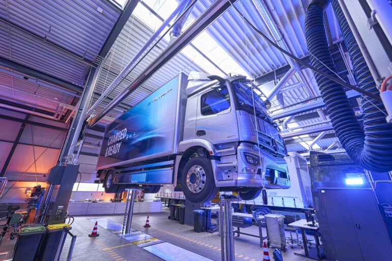 Der Neubau ist von Beginn an auf die Zukunft des Transportwesens hervorragend vorbereitet: So wurden beispielsweise Hochvolt-Arbeitsplätze eingerichtet, um batterieelektrische Modelle wie die Mercedes-Benz Lkw eActros und eEconic, den FUSO eCanter sowie den Stadtbus Mercedes-Benz eCitaro im Service bedienen zu können. Zudem ist in Stuttgart ein hochmoderner, variabel anpassbarer Arbeitsplatz entstanden, um an den Dächern von Fahrzeugen – am Lkw-Fahrerhaus oder Omnibusdach – zu arbeiten. Dieser sogenannte Dacharbeitsplatz ist insbesondere für den elektrischen Stadtbus Mercedes-Benz eCitaro relevant, da er seine Batterien auf dem Dach trägt.