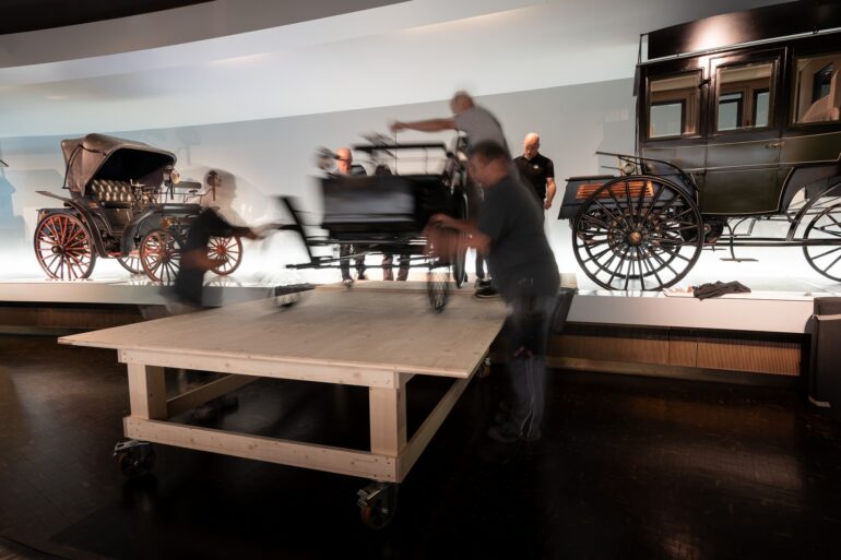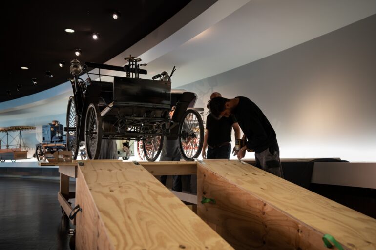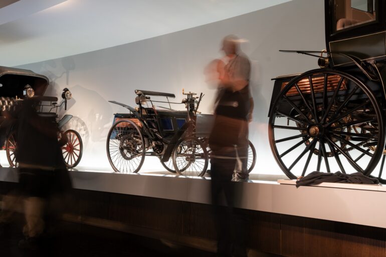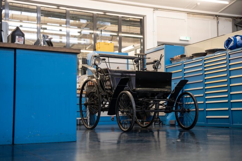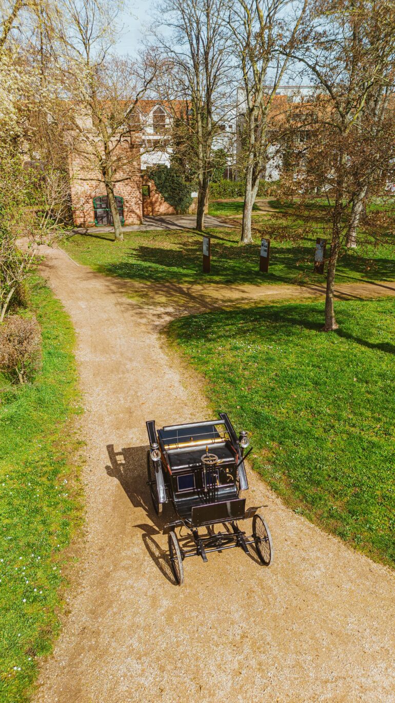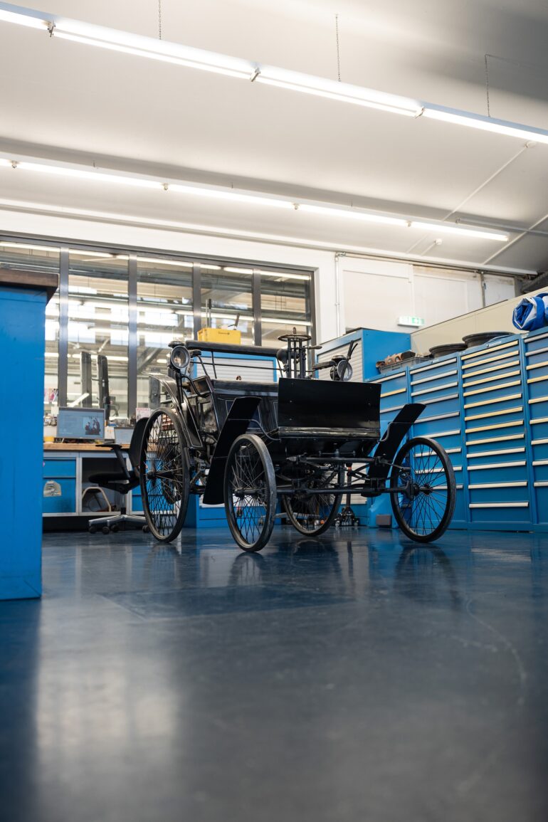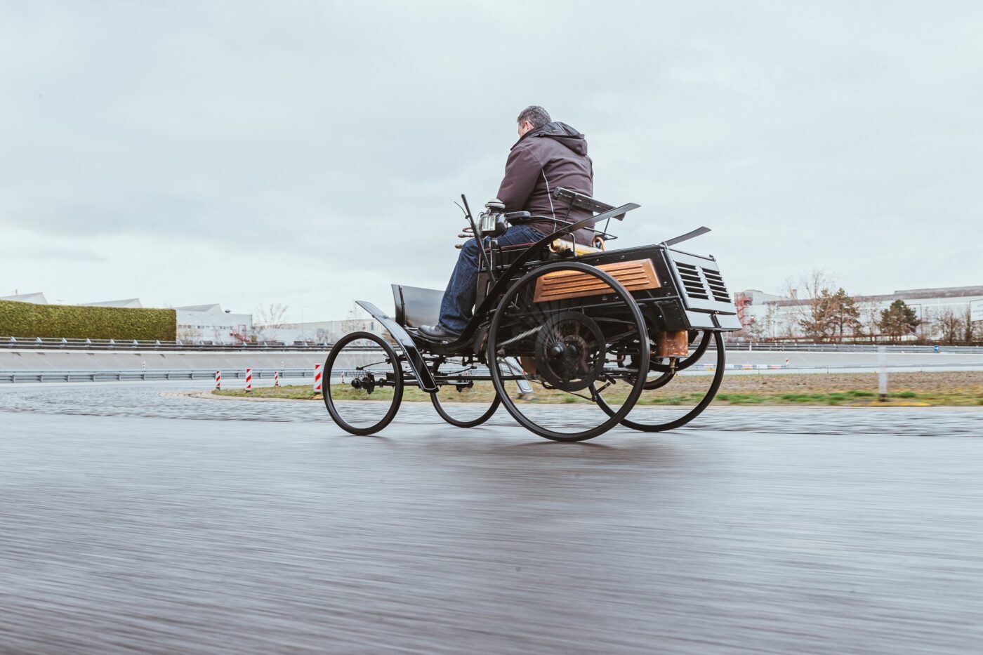 Im Mercedes-Benz Werk Sindelfingen unternimmt das 130 Jahre alte Benz Motor Velociped im März 2024 seine erste Ausfahrt im Jubiläumsjahr. Zum Standort gehört die Factory 56 mit modernster Produktionstechnik. Hier erprobt Mercedes-Benz beispielsweise den Einsatz humanoider Roboter in der Fertigungslogistik. Projekte wie dieses sind heute so innovativ wie vor 130 Jahren die Entwicklung und Produktion des ersten Serienautomobils der Geschichte.