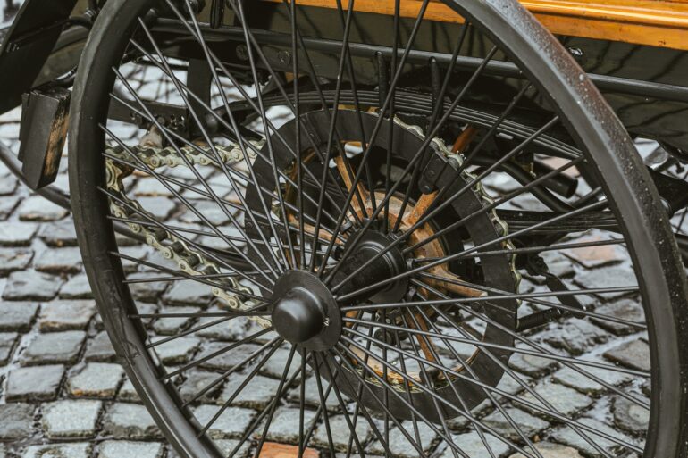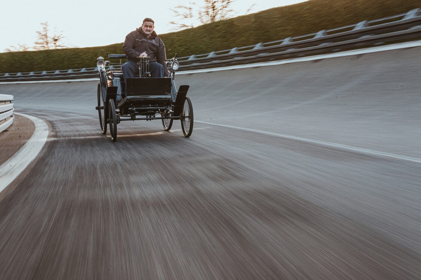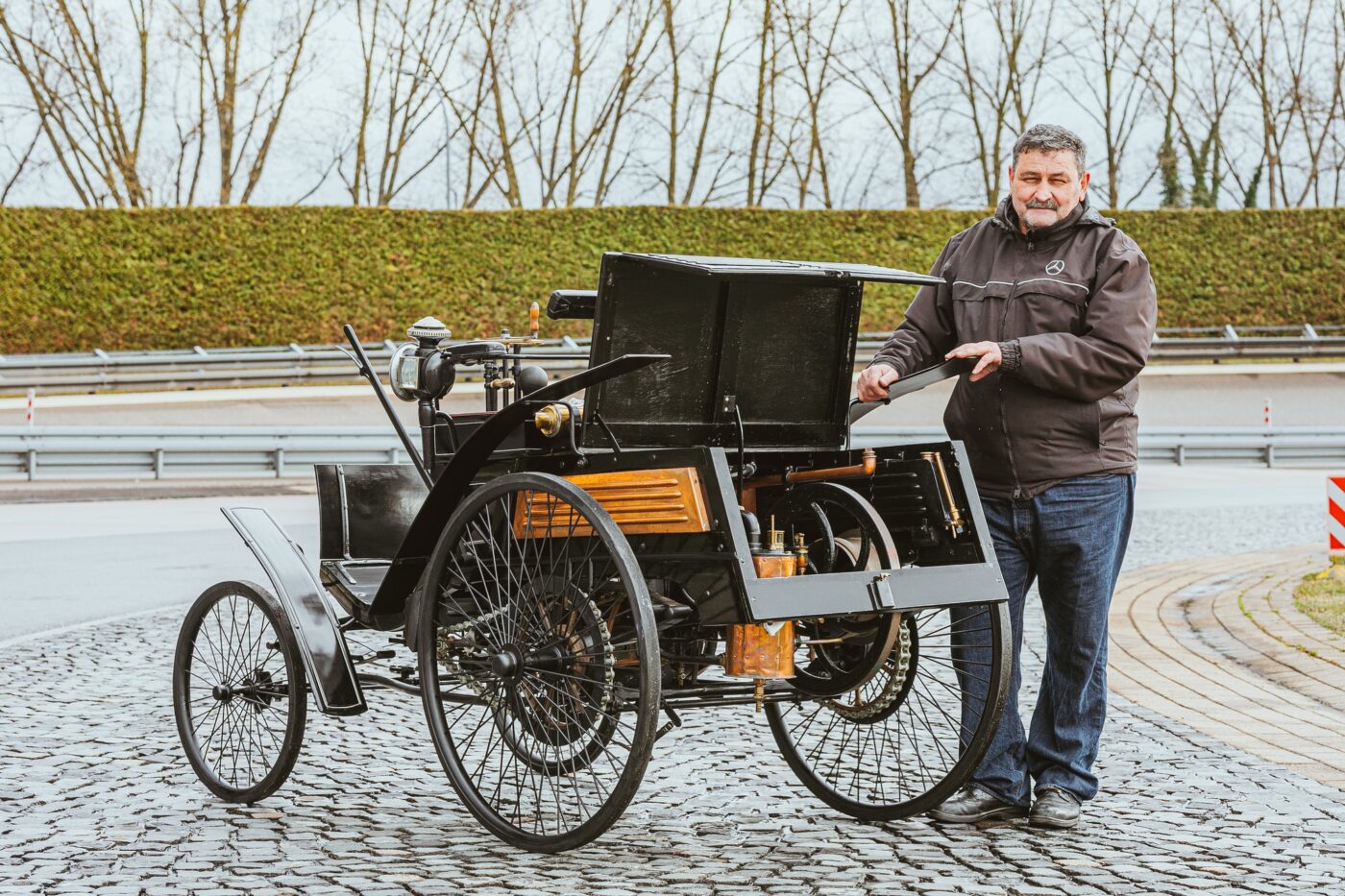 Im Mercedes-Benz Werk Sindelfingen unternimmt das 130 Jahre alte Benz Motor Velociped im März 2024 seine erste Ausfahrt im Jubiläumsjahr.