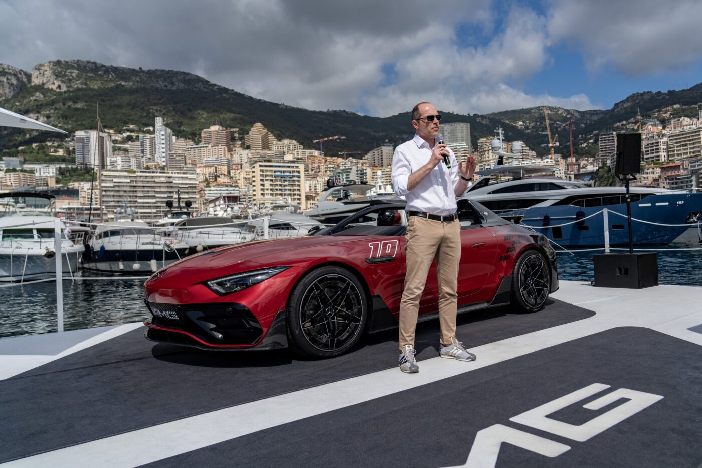 Das Concept Mercedes-AMG PureSpeed ist das Highlight im Vorfeld des Formel 1™ Grand Prix von Monaco. Der radikale Entwurf eines komplett offenen, zweisitzigen Performance Cars ohne Dach und Windschutzscheibe ist eine Hommage an den Rennsport. Das Konzeptfahrzeug gibt einen Ausblick auf das erste Modell der stark limitierten Mercedes‑Benz Mythos-Serie. Die Weltpremiere des Concept Mercedes-AMG PureSpeed hat dabei in exklusivem Rahmen am Rande des Formel 1™ Grand Prix von Monaco stattgefunden: Das Fahrzeug wurde im Hafen des Fürstentums auf einem schwimmenden Ponton enthüllt und begeisterte auch die Fahrer des Mercedes‑AMG PETRONAS F1 Teams, Lewis Hamilton und George Russell.