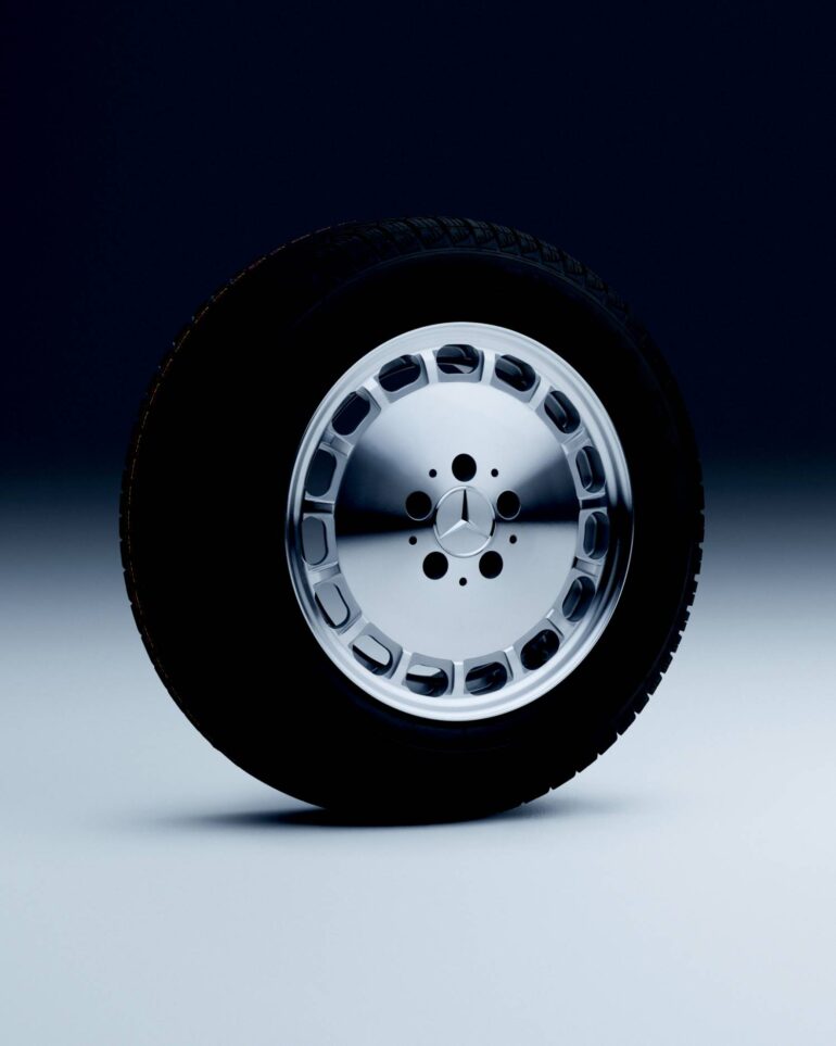 In den 1980er-Jahren entwickelte Mercedes‑Benz minimalistisch gestaltete 15‑Loch- und 8‑Loch-Leichtmetallräder. Ihr Design nahm mit dem glattflächigen Aussehen eine klare Formensprache an. Das vollflächige Rad wurde über alle Baureihen hinweg eingesetzt, auch beim seinerzeit sportlichsten Modell 190 E 2.3‑16. Der „Baby‑Benz“, so sein liebevoller Spitzname, wurde schnell zum nächsten Kultfahrzeug. Eines davon steht heute im Mercedes‑Benz Museum: der 190 E 2.3 des Schauspielers Nicolas Cage. Ein weiteres prominentes Beispiel für das 15‑Loch‑Rad ist die Limousine 500 SEL (Baureihe 126), die auch Michael Jackson in seinem Fuhrpark hatte. Die 15‑ und 8‑Loch‑Räder sind zeitlose Klassiker. Ihr vollflächiges Design wurde später auch bei den Monoblock-Rädern von AMG und Maybach immer wieder neu interpretiert.