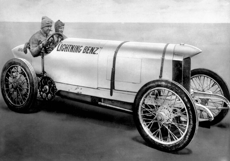 Bei sportlichen Fahrzeugen setzten sich schnell die leichten und trotzdem robusten Drahtspeichenräder durch: Sie hatten rund 50 Prozent weniger Gewicht als ihre hölzernen Pendants. Bei Renneinsätzen und Rekordfahrten bekamen sie oft Verkleidungen aus Stahlblech oder Aluminium. Diese sogenannten Scheibenräder verursachten weniger Luftverwirbelungen und brachten damit erhebliche aerodynamische Vorteile. Ein prominentes Beispiel ist der 200 PS Blitzen‑Benz. 1911 war er mit 228 km/h Spitze das schnellste Fahrzeug der Welt. Selbst Flugzeuge und Lokomotiven konnten ihn nicht einholen. Der Blitzen‑Benz wurde weltweit zum Symbol für sportliche Rekorde und zur Legende, die bis heute wirkt – auch in der Kunst. So veröffentlichte zum Beispiel das Magazin „Esquire“ 1944 eine Serie mit Rennsportdarstellungen des New Yorker Künstlers Peter Helck. Sie zeigte unter anderem den damaligen Rekordfahrer Barney Oldfield am Steuer des Blitzen‑Benz.