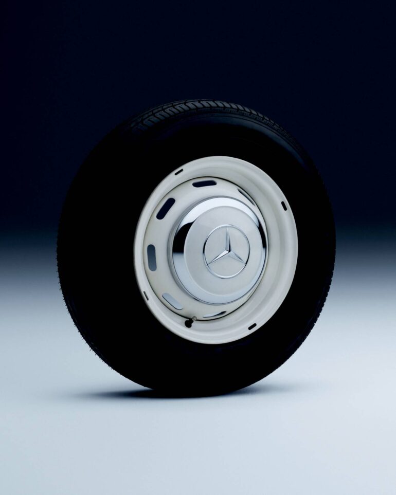 Jenseits des aufblühenden Motorsports kam immer häufiger das Stahlblechscheibenrad zum Einsatz. Es ließ sich wesentlich effizienter und in großen Stückzahlen herstellen. Zuerst rollte die wegweisende Limousine 170 von 1931 auf diesen Rädern. Das Design war gekrönt von kleinen Nabenkappen mit feinen Zierlinien und dem Mercedes‑Benz Stern in der Mitte. Verschiedene Farben von tiefem Schwarz bis zur Wagenfarbe sowie verchromte Zierringe ermöglichten es, individuelle Kundenwünsche zu erfüllen. Anfang der 1950er‑Jahre verfeinerte Mercedes‑Benz das Design weiter. Zusätzlich zu den Radkappen kamen gelochte Zierringe als neues Gestaltungselement hinzu. Premiere feierte diese chromglänzende Feinheit 1954 mit dem „Ponton‑Mercedes“ Typ 220 (W 180) und der repräsentativen Limousine des Mercedes‑Benz Typ 300 b (W 186 III), dem sogenannten „Adenauer‑Mercedes“. Als die 1960er Jahre anbrachen, stand auch der Mercedes‑Benz 600 Pullman (W 100) auf diesen Stahlblechrädern. Diese ikonische Limousine galt zu ihrer Zeit als das beste Auto und war nicht nur bei Staatslenkern beliebt. Auch Musiker wie John Lennon und Elvis Presley fuhren den 600er Pullman.