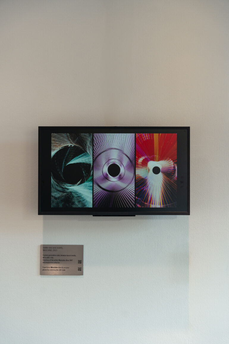 In Salomé Chatriots Werken verschmelzen maschinelle und organische Qualitäten zu (Körper-)Landschaften. Mittels Skulptur, Malerei und einem Rendering-Programm, das den Atem der Künstlerin in Bilder übersetzt, erweitert sie die Auseinandersetzung mit Technologie um die Aspekte Geschlecht, Identität und Körperlichkeit. Mit Maschine schafft Harm van den Dorpel Blockchain-basierte Kunst, die sich ständig weiterentwickelt. Die NFT-Kollektion wurde in Zusammenarbeit mit Mercedes-Benz NXT entwickelt und ist vom sogenannten Wagenrad-Effekt inspiriert. Dabei scheinen sich Speichenräder im Widerspruch zu ihrer tatsächlichen Geschwindigkeit und Richtung zu drehen.