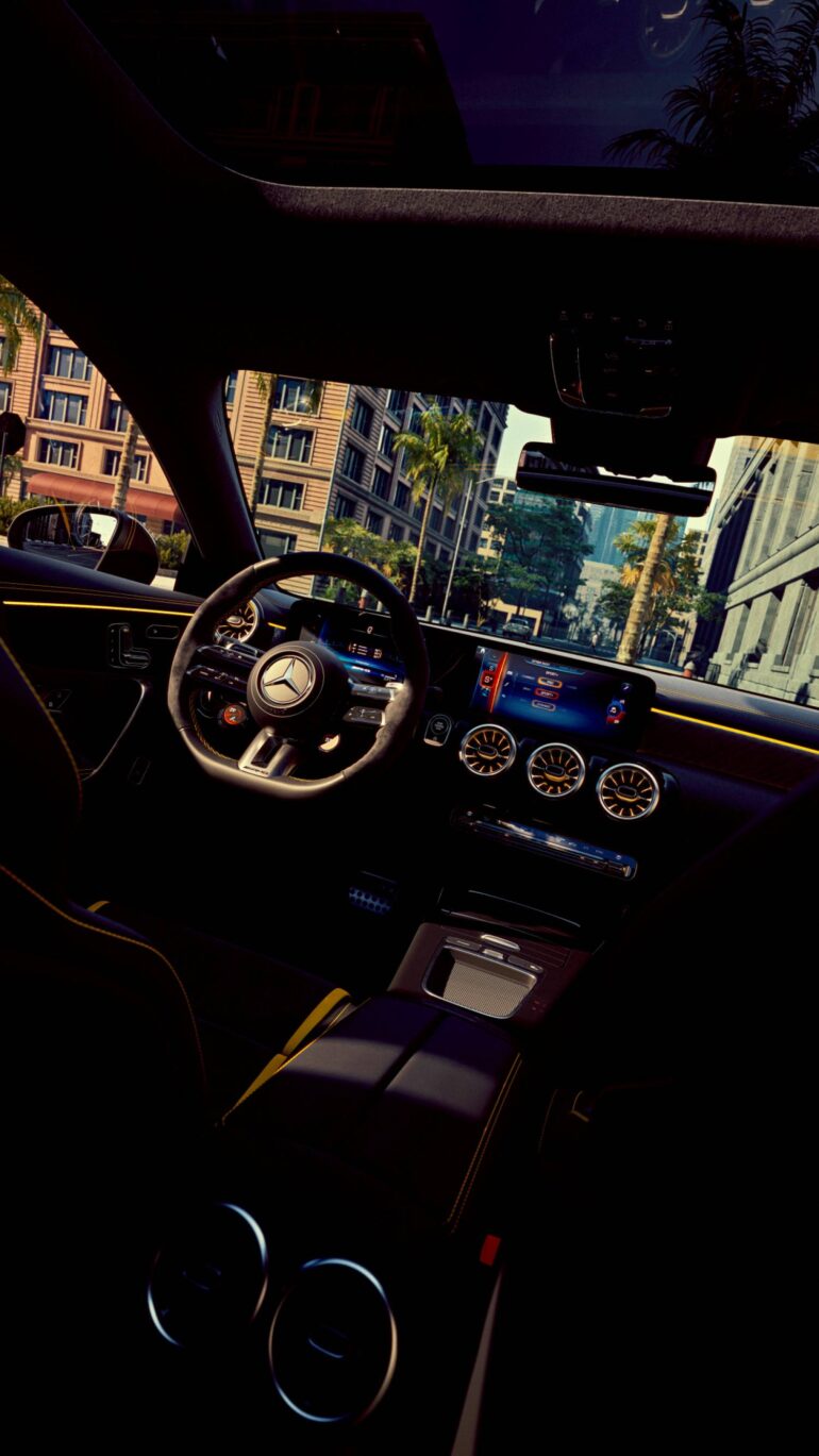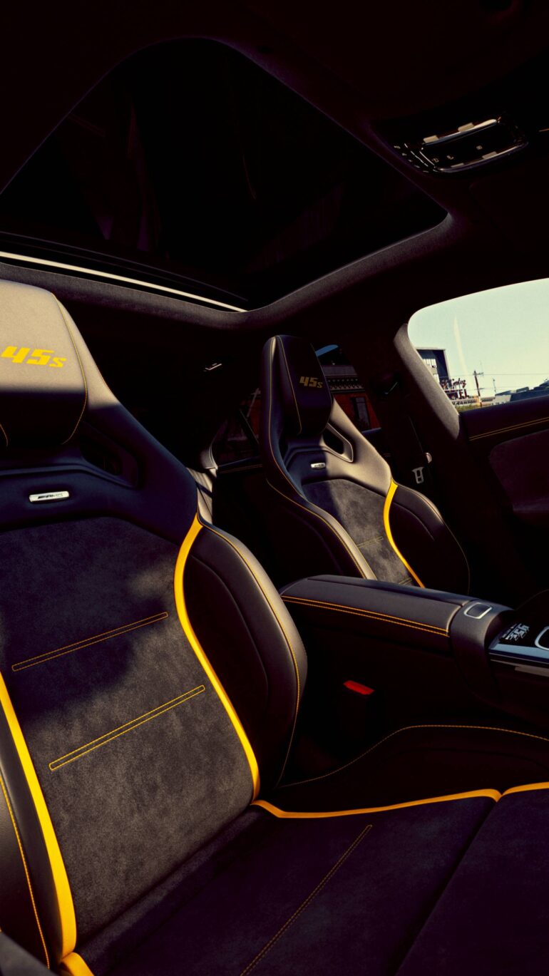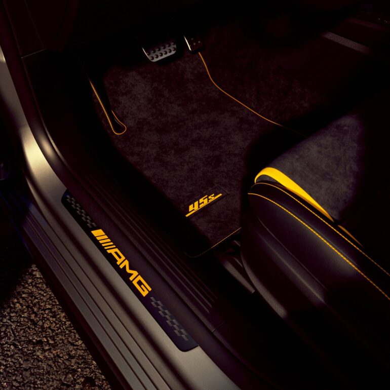 Auch im Innenraum unterstreicht AMG den exklusiven Anspruch. Sportsitze in ARTICO/MICROCUT mit gelben Kontrastnähten, ein Performance-Lenkrad in Nappa und Mikrofaser, gelbe Embleme, spezielle Zierleisten in Aluminium und gebrandete Fußmatten setzen individuelle Akzente. „45 S“-Schriftzüge auf Kopfstützen und Mittelkonsole machen klar: Dieses Fahrzeug ist nicht einfach ein AMG – es ist das letzte seiner Art.