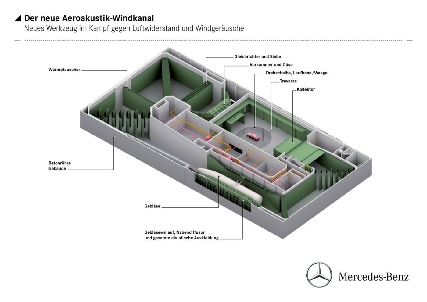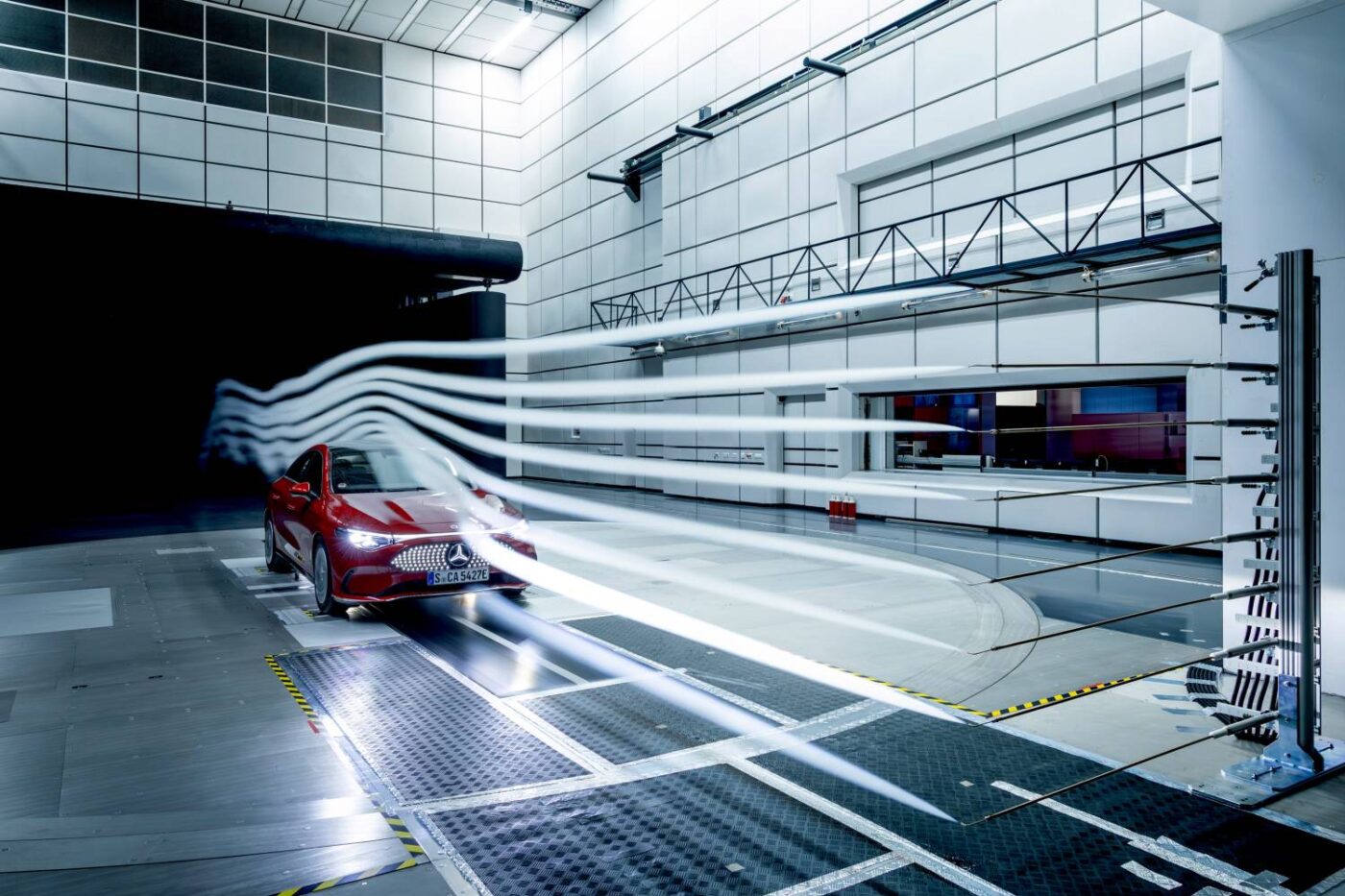 Der Einsatz modernster Messtechnik ist Teil dieser Erfolgsgeschichte. Bereits 1943 führte Mercedes-Benz die ersten Versuche im „Großen Windkanal“ in Untertürkheim durch – der damals weltweit erste seiner Art für Autos. Heute ergänzt der Aeroakustik-Windkanal in Sindelfingen (seit 2013) diese Tradition, um Geräuschkomfort und Luftströmung noch präziser zu analysieren. Diese Einrichtungen erlauben es, den gesamten Fahrzeugunterboden, Spoiler-Positionen und Spaltmaße bis ins kleinste Detail zu perfektionieren.