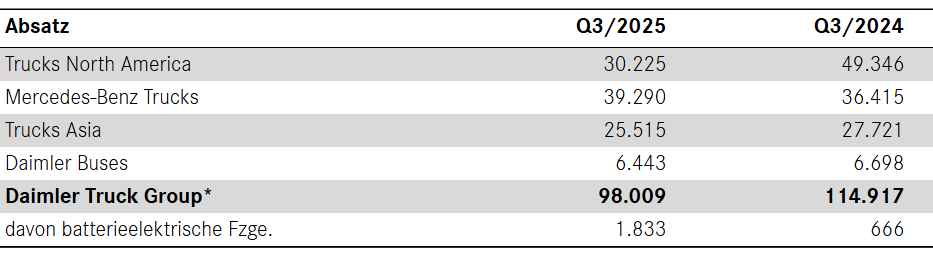 ie Daimler Truck AG hat im dritten Quartal 2025 weltweit 98.009 Fahrzeuge ausgeliefert. Gegenüber dem Vorjahresquartal (114.917 Einheiten) entspricht das einem Rückgang um 15 Prozent. Ursache sind vor allem schwächere Märkte in Nordamerika und Asien, während Europa stabile Ergebnisse zeigt.