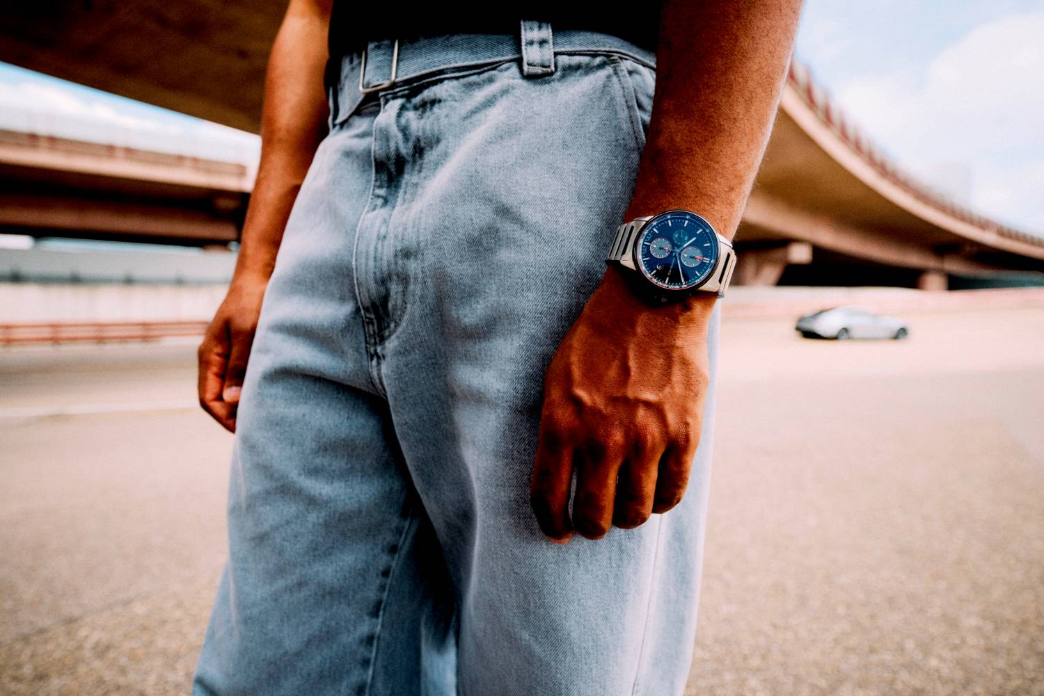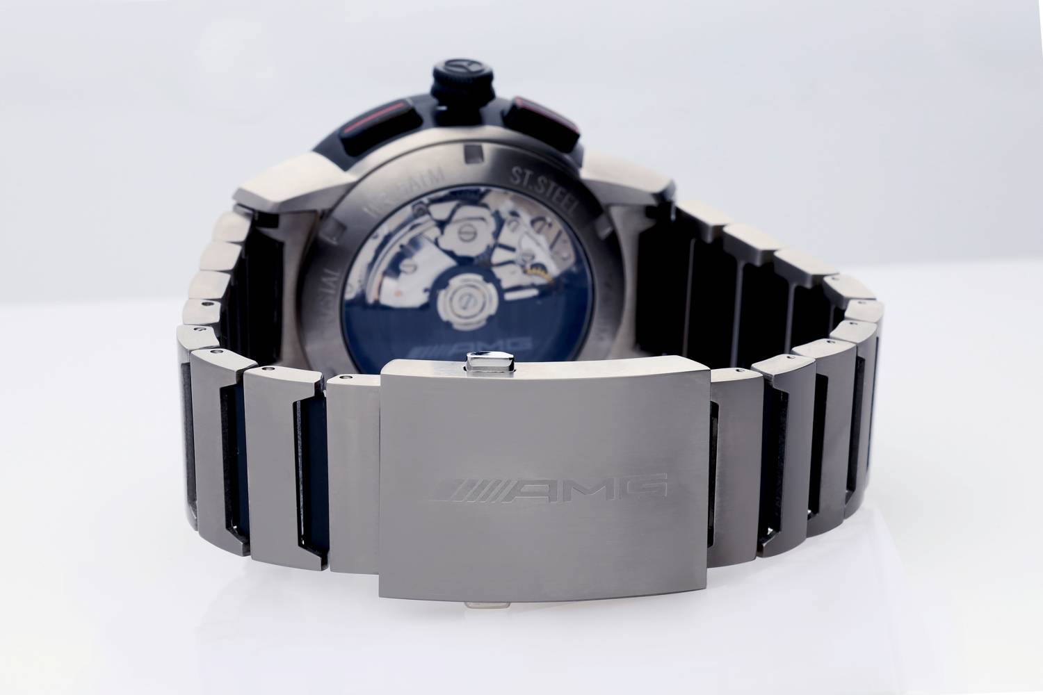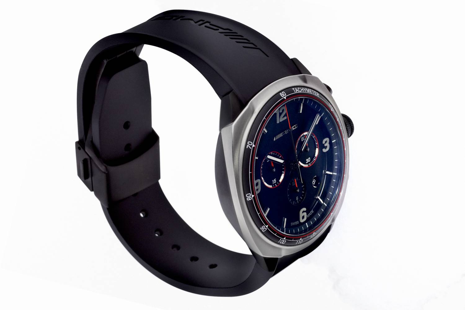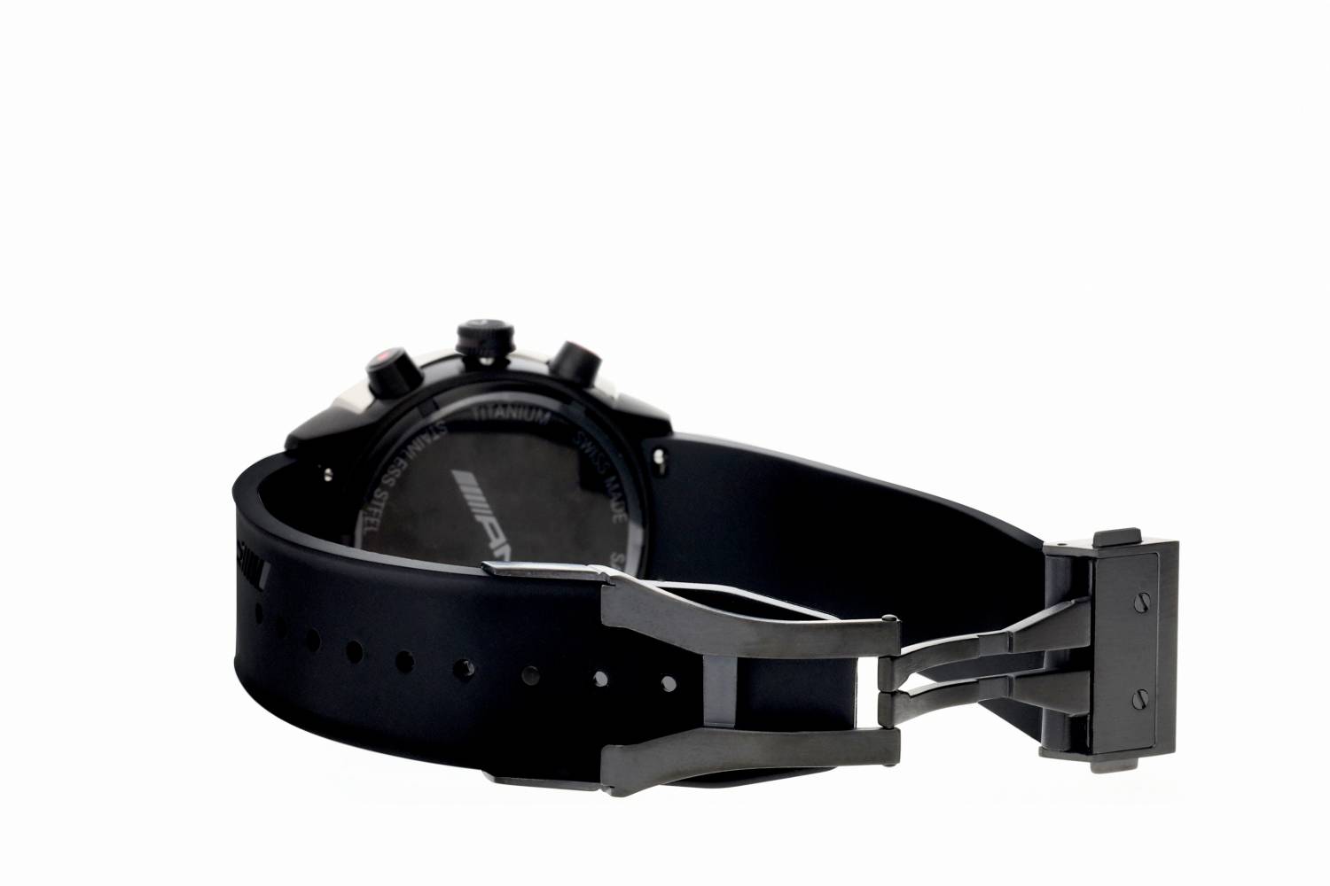Das mehrteilige Gehäuse vereint PVD-beschichteten Edelstahl mit einer Titanspange, die Gewicht reduziert und den Tragekomfort optimiert. Das Titanarmband liegt angenehm leicht an, während das Zifferblatt mit applizierten Indizes, leuchtenden Zeigern und feinen roten Akzenten das typische AMG-Design zitiert. Der Chronograph misst 43,5 mm im Durchmesser, ist 15 mm hoch und bis 5 ATM wasserdicht – ein souveräner Begleiter für Business und Freizeit, kraftvoll und stilvoll zugleich.