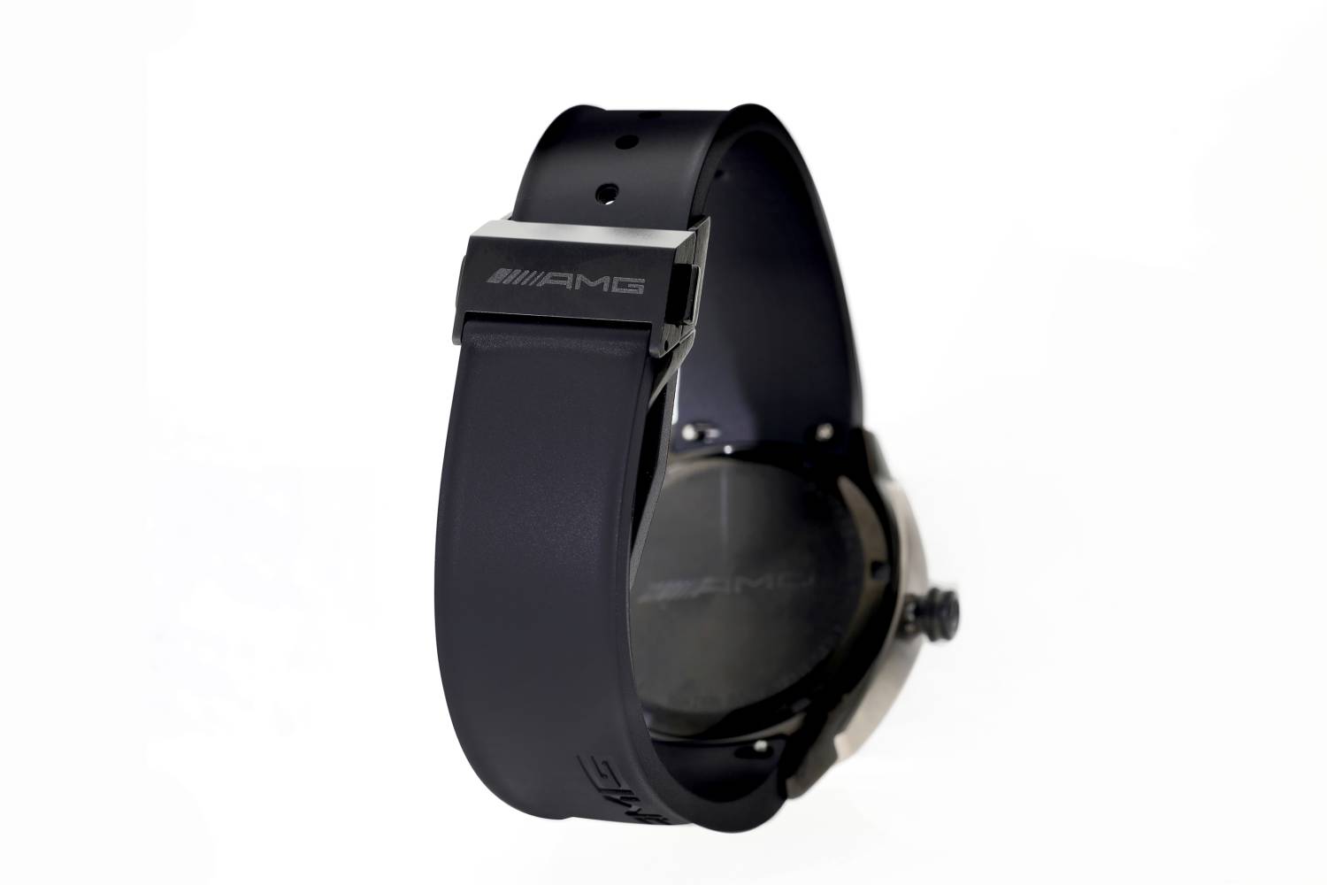 Das nahtlos integrierte Kautschukband mit verdeckter Faltschließe unterstreicht den sportlichen Charakter. Mit 40 mm Durchmesser, 10,5 mm Höhe und 5 ATM Wasserdichtigkeit steht dieses Modell für puristische AMG-Performance – reduziert auf das Wesentliche.