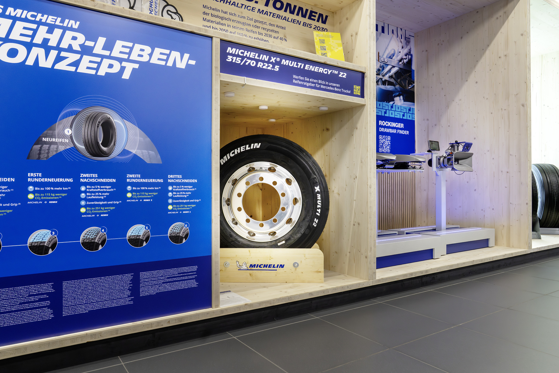 Die neu gestaltete Truck Lounge bietet auf 1.400 Quadratmetern Raum für Gespräche und Begegnungen. Eine zentrale Rotunde mit Barista-Bar, moderne Möbel und offen präsentierte Lkw-Exponate schaffen ein harmonisches Zusammenspiel von Marke, Produkt und Raum. In der World of Partnership unterstreicht eine 70 Meter lange Präsentationswand mit Exponaten von 17 Partnerunternehmen den partnerschaftlichen Ansatz der Marke – ein gelebtes Bekenntnis zu Zusammenarbeit und Vertrauen.