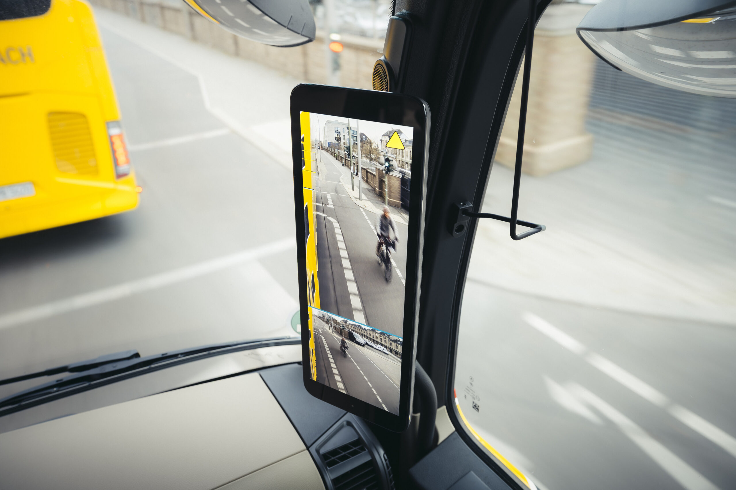 Eine zentrale Rolle spielt dabei die von Mercedes-Benz Trucks und Daimler Buses entwickelte MirrorCam. Das Kamera-Monitor-System erleichtert Überholen, Rangieren und Kurvenfahrten und arbeitet eng mit dem Abbiegeassistenten zusammen, der Warnhinweise direkt im Display der MirrorCam einblendet.