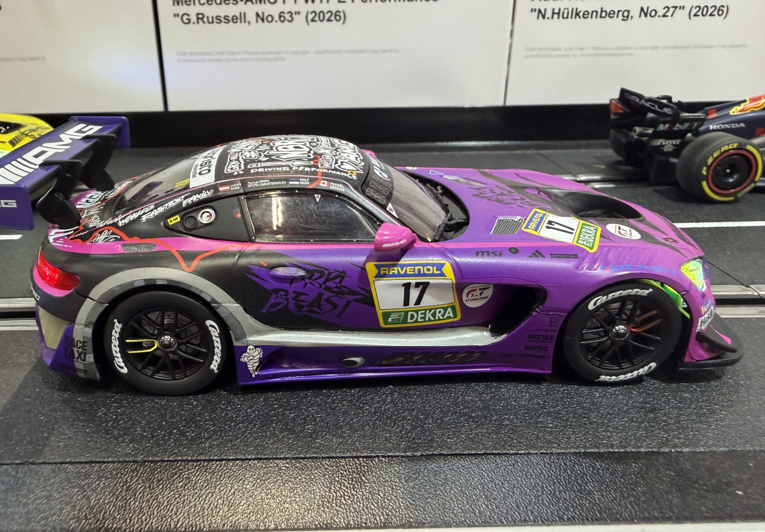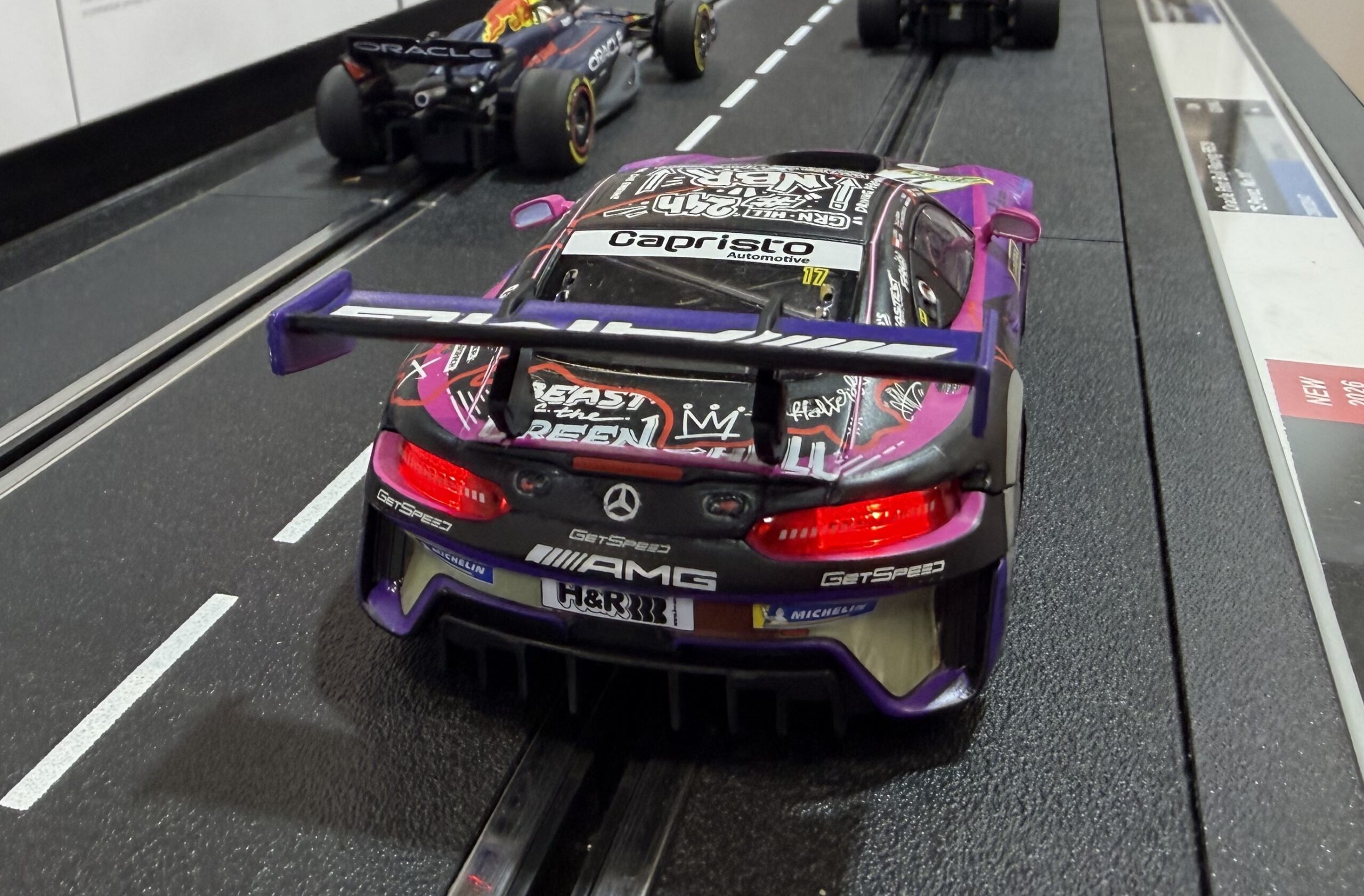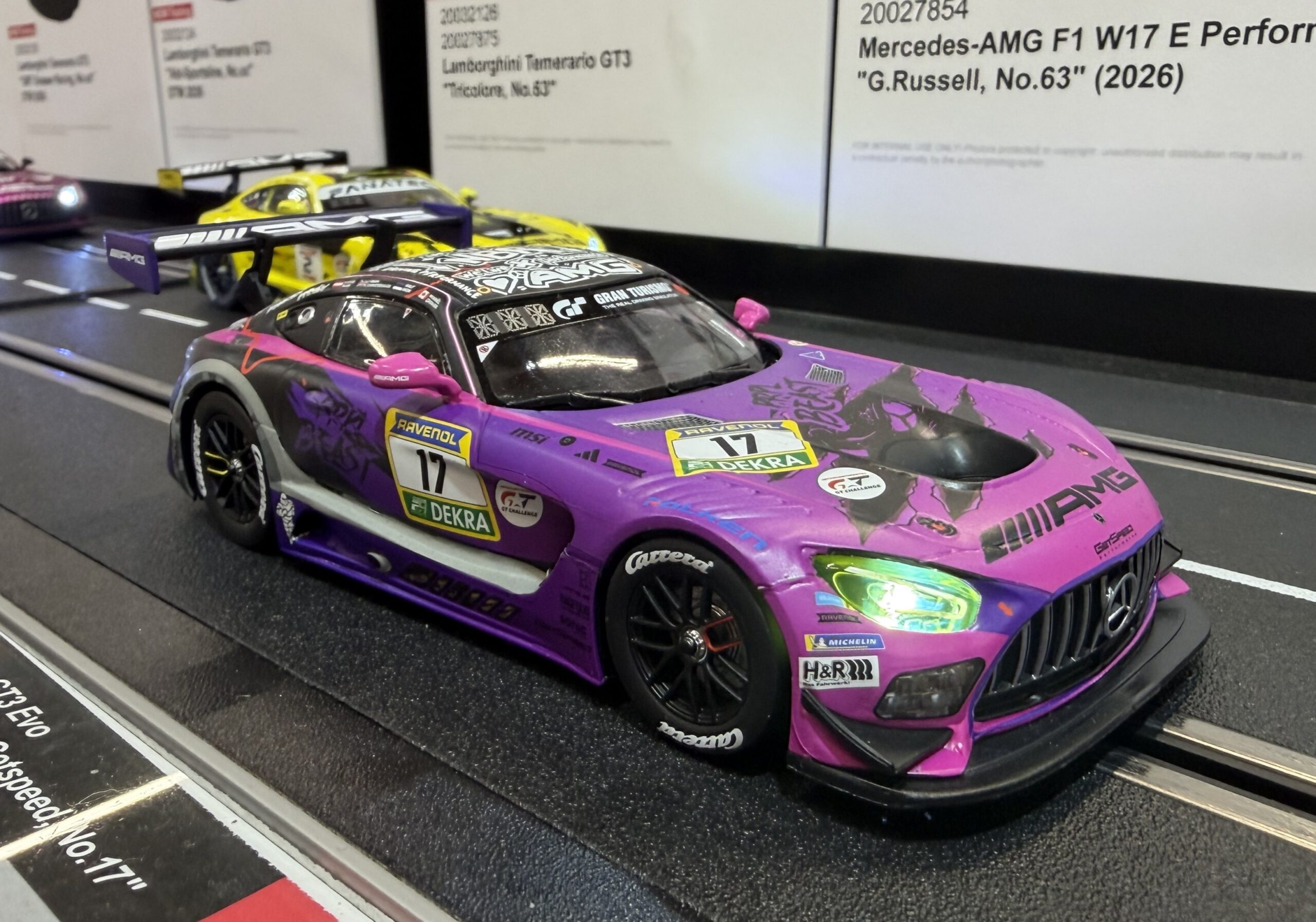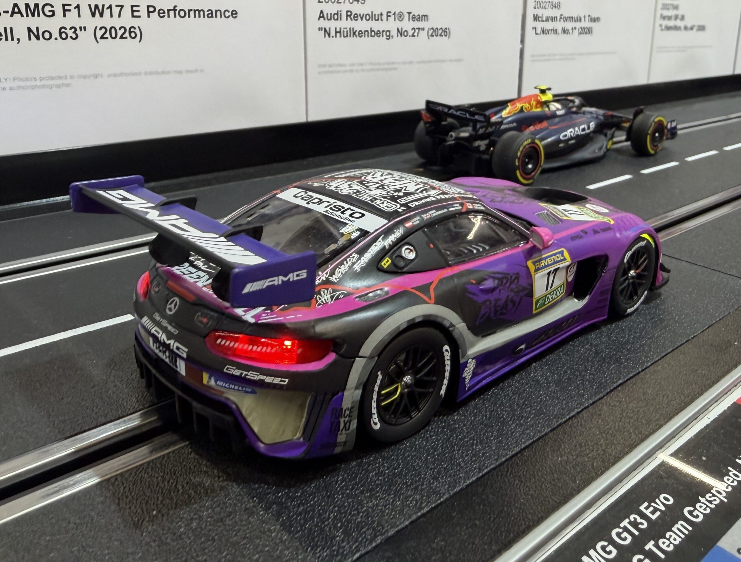Der Mercedes-AMG GT3 EVO steht für modernste GT3-Technik und ist auf den Rennstrecken weltweit zu Hause. In der Lackierung des Mercedes-AMG Team Getspeed mit der Startnummer 17 bringt Carrera das kompromisslose Motorsport-Design nun auf die heimische Rennbahn. Charakteristische Details wie die aggressive Frontpartie, der große Heckflügel sowie die markante Fahrzeuglinie des EVO wurden laut Hersteller originalgetreu umgesetzt – und das wirkt vor Ort auch so.