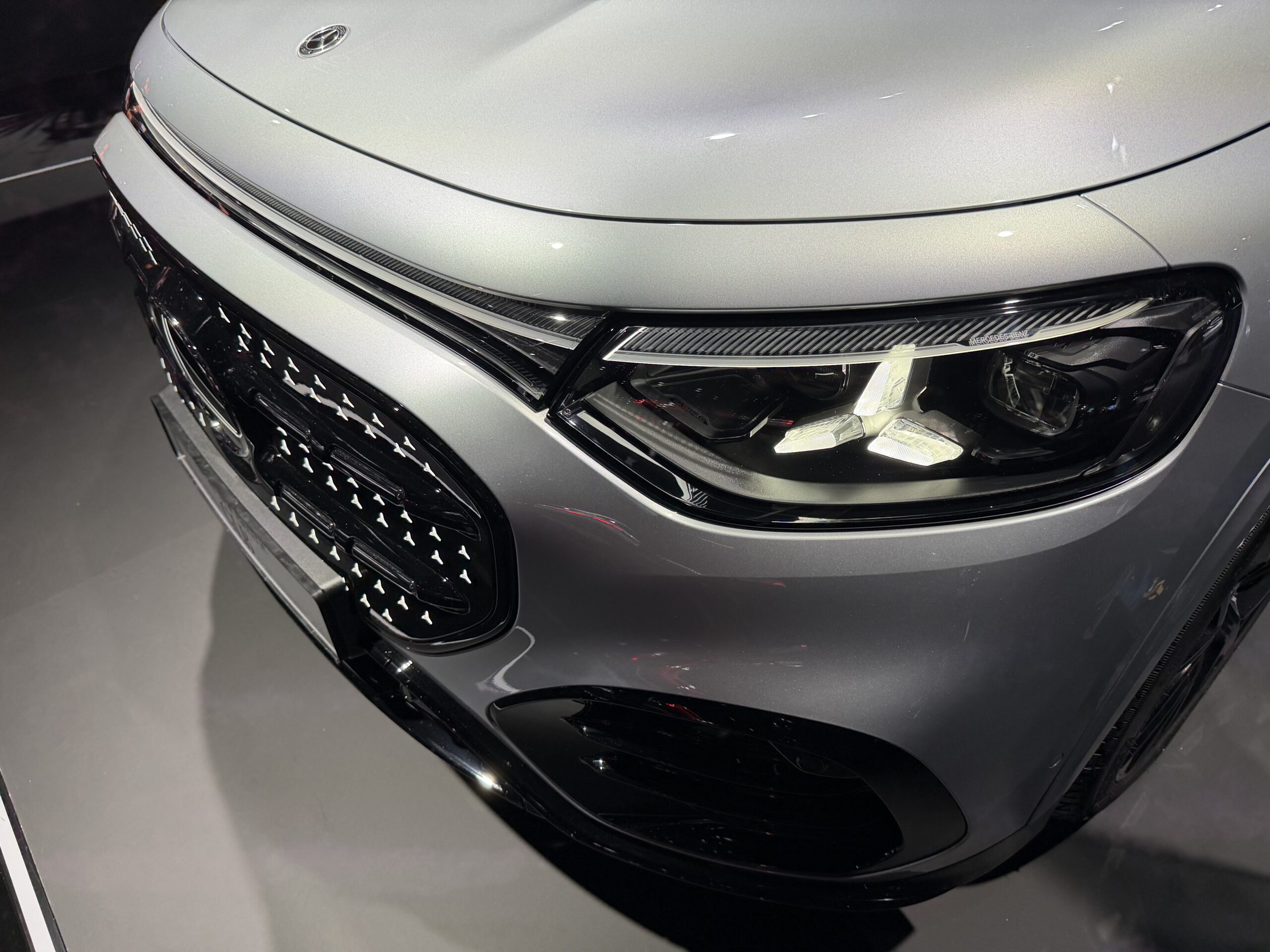 Charakteristisch für den GLB EQ ist die Frontgestaltung mit dem neuen beleuchteten Grills mit Mercedes-Pattern, das anstelle des klassischen Kühlergrills tritt. Im Gegensatz zum CLA ist der Grill jedoch mit weniger Pattern belegt und – auffällig in der Seitenansicht – nahezu das vorderste Element der ganzen Front. Die kantige Form des Vorgängers bleibt aber auch in der Neuauflage des GLB erhalten.
