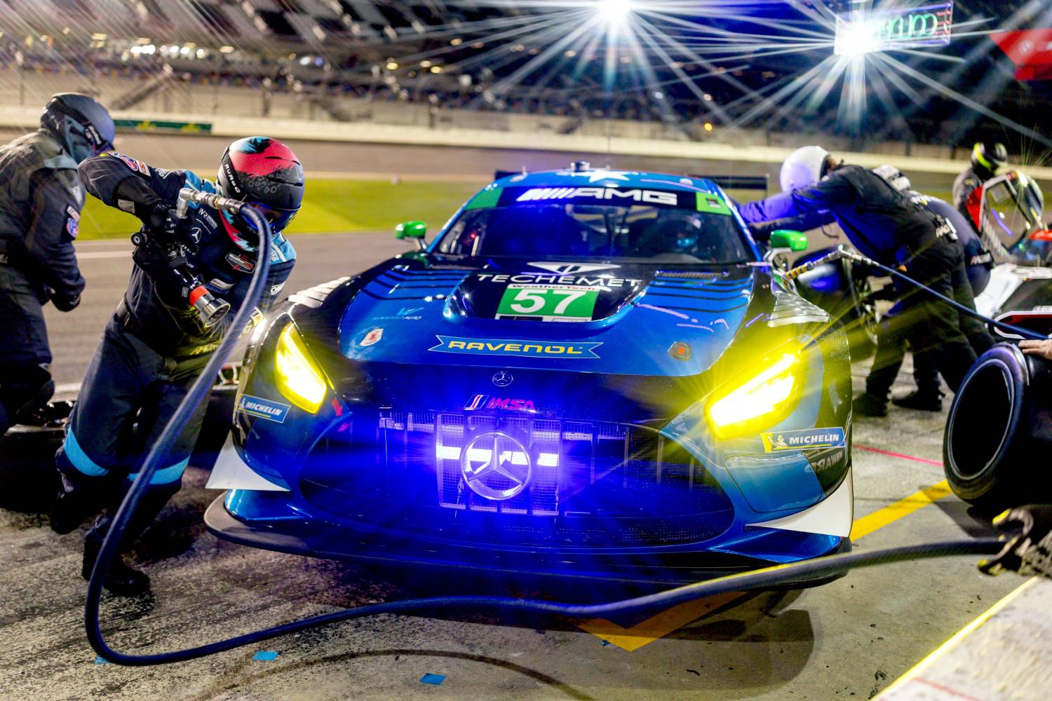 Der Langstreckenklassiker auf dem Daytona International Speedway begann turbulent. Mehrere Unfälle in der Anfangsphase sorgten für Nervosität im Feld, doch alle fünf eingesetzten Mercedes-AMG GT3 blieben dank präziser Arbeit der Teams und der erfahrenen Spotter unversehrt. Spätestens mit Einbruch der Nacht wurde das Rennen zu einer Geduldsprobe: Dichter Nebel legte sich über die Strecke und zwang die Rennleitung zu einer außergewöhnlich langen Safety-Car-Phase. Insgesamt 6:33 Stunden wurde das Feld neutralisiert – ein neuer Rekord in der Geschichte des Rennens.