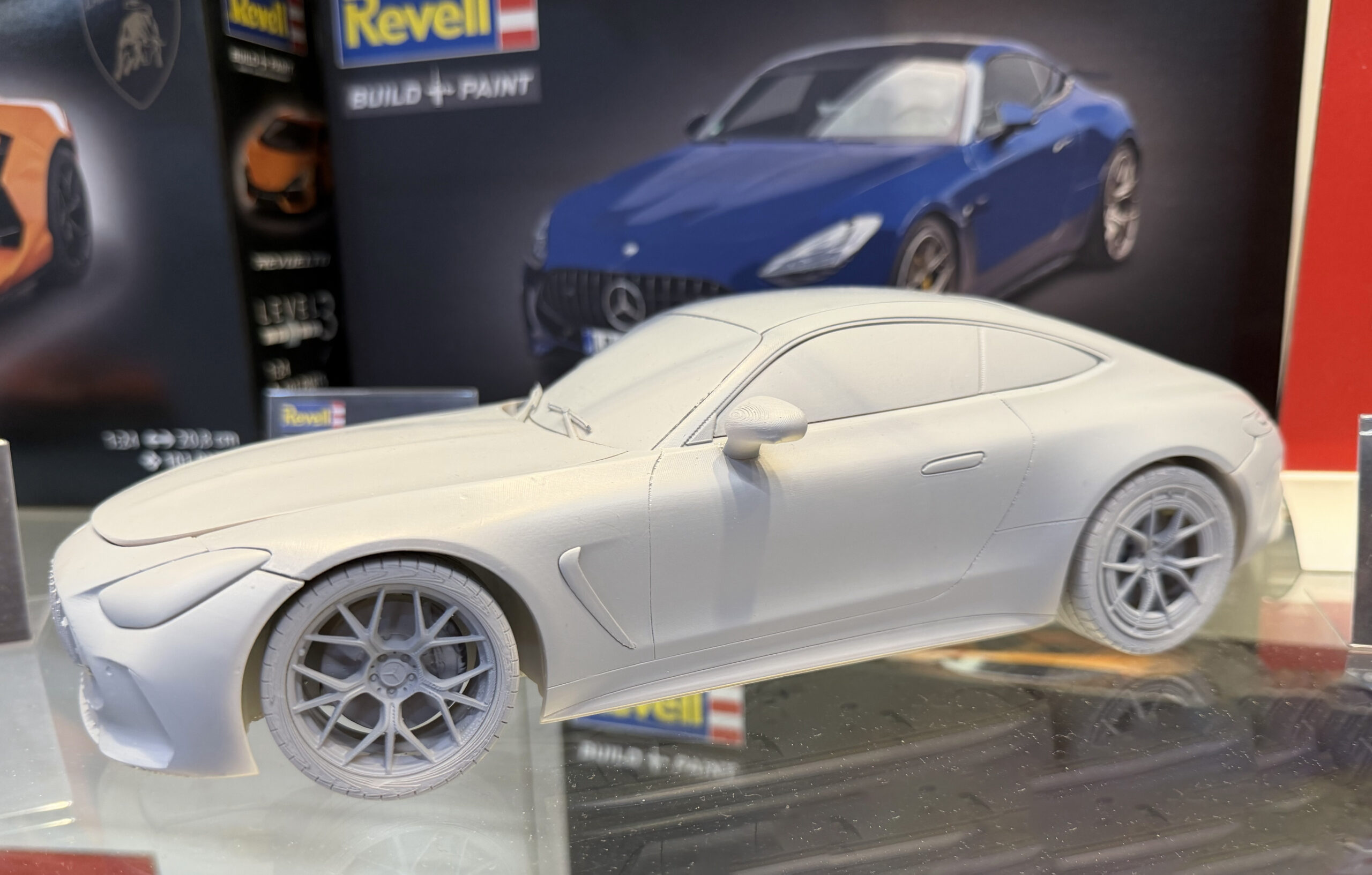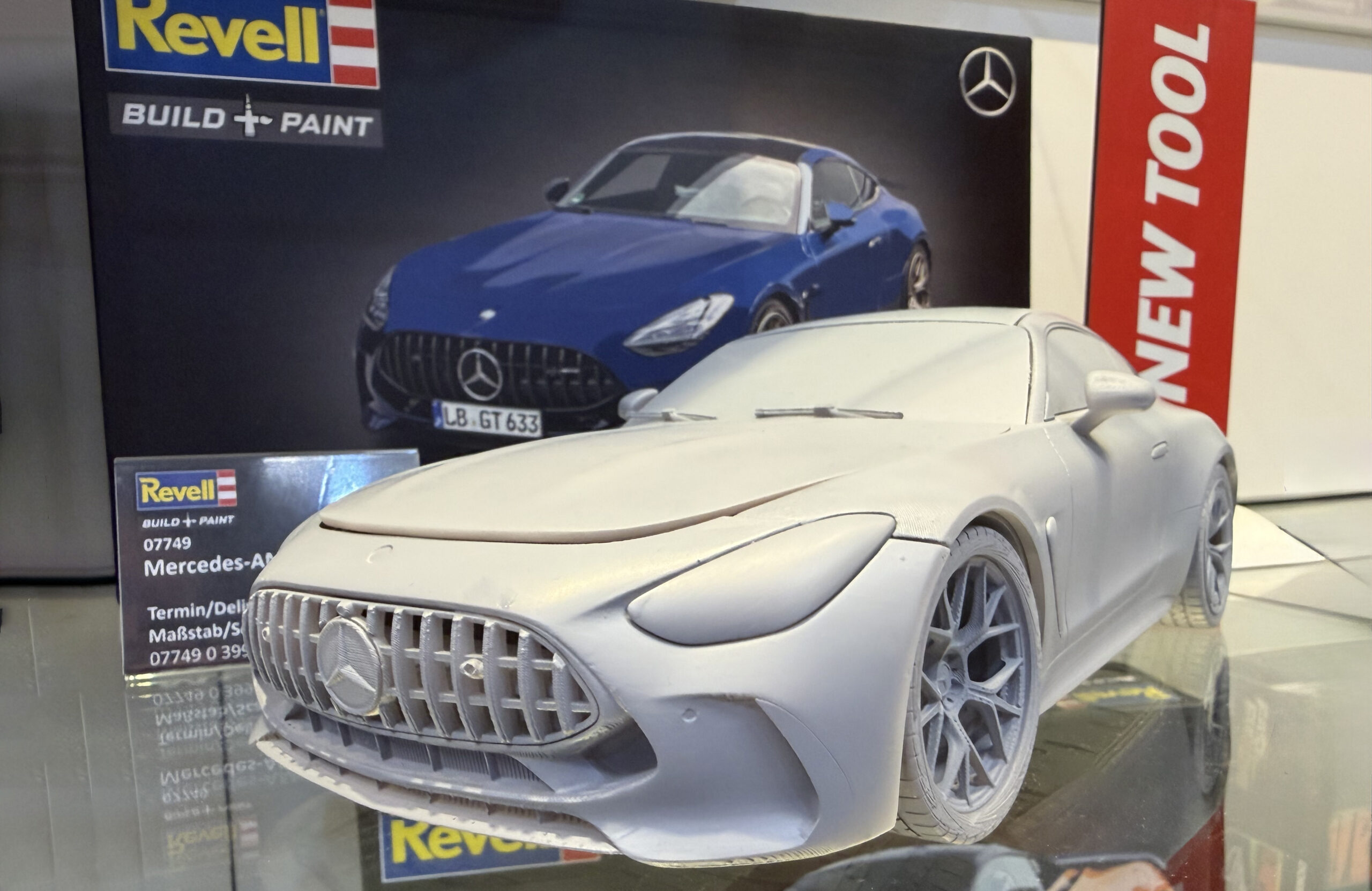 Der auf der Messe gezeigte Prototyp war dabei alles andere als klein. Revell entschied sich bewusst dafür, ein um 150 Prozent vergrößertes Muster auszustellen, um Formen, Linienführung und Konstruktionsdetails besser sichtbar zu machen. Gerade beim Mercedes-AMG GT 63, dessen Design von scharfen Kanten, kraftvollen Proportionen und aerodynamischen Feinheiten lebt, erwies sich dieser Ansatz als sinnvoll. Besucher konnten so einen sehr guten Eindruck davon gewinnen, wie präzise die charakteristische AMG-Optik ins Modell übertragen werden soll. Das man beim Prototyp dabei auf 3D-Druck setze, war jedoch erkennbar.