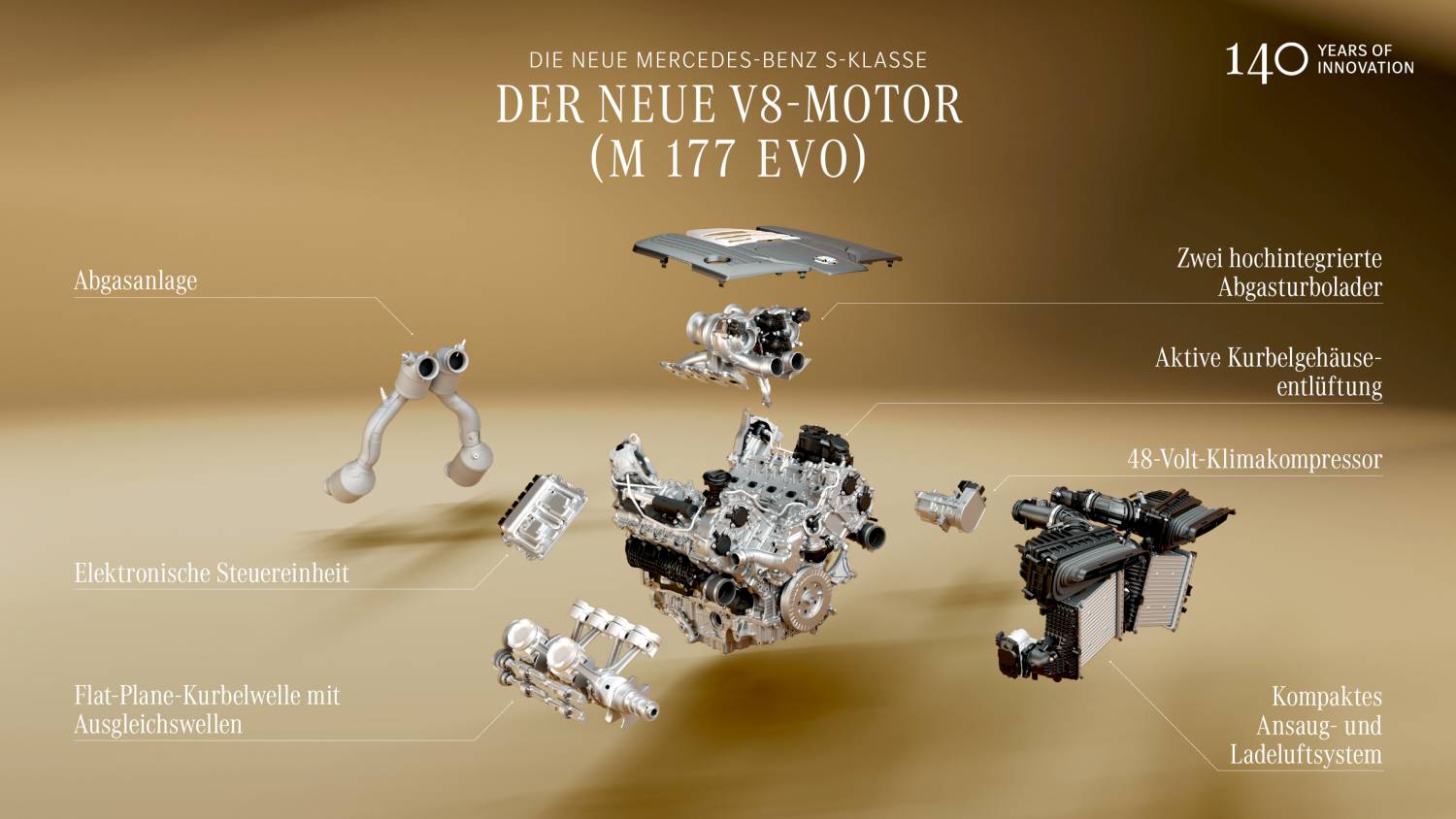 Der neue V8 Motor M177 Evo von Mercedes-Benz markiert die jüngste Entwicklungsstufe des bekannten 4,0-Liter-V8-Biturbo und steht für eine gelungene Verbindung aus hoher Leistung, Effizienz und außergewöhnlicher Laufkultur. Eingesetzt wird das Triebwerk erstmals in der Mercedes-Benz S 580 4MATIC Limousine in Langversion, wo es mit 395 kW (537 PS) und einem maximalen Drehmoment von 750 Nm überzeugt, das über einen breiten Drehzahlbereich von 2.500 bis 4.500 U/min zur Verfügung steht.
