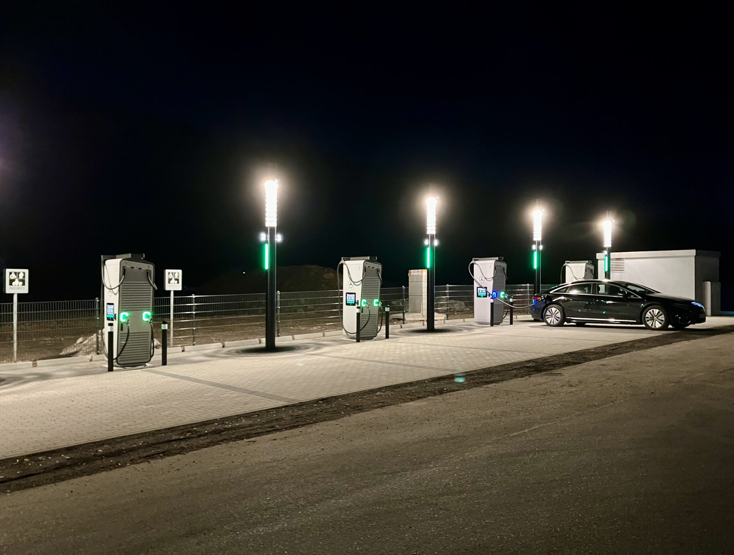 Der neue Ladeparkvon Mercedes-Benz bietet großzügig dimensionierte Stellplätze sowie ein hochwertiges, markentypisches Design mit beleuchteten Orientierungselementen, nummerierten Parkplätzen und einer dynamischen Statusanzeige zur Information über Verfügbarkeit und Ladestatus. In unmittelbarer Nähe stehen ein Bistro sowie verschiedene Einkaufsmöglichkeiten zur Verfügung. Auf eine Überdachung der Ladeplätze wird aber – wie an vielen anderen Standorten – verzichtet.