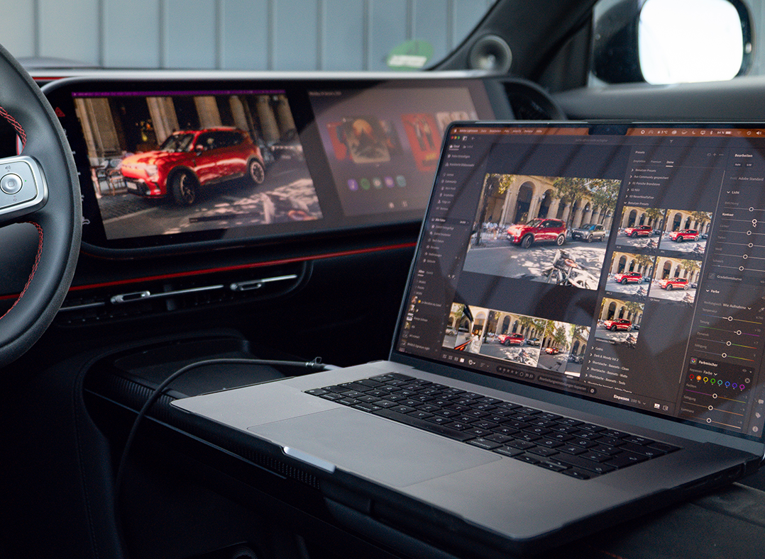 Neu ist außerdem die kabelgebundene Bildschirmspiegelung. Laptops, Tablets oder Smartphones lassen sich über einen HDMI-Converter an den USB-C-Anschluss anschließen, um Inhalte im Stand auf dem zentralen Display sowie dem Beifahrerbildschirm anzuzeigen und zwischen beiden Bildschirmen zu verschieben. So dient der smart #5 als mobiler Arbeitsplatz oder Entertainment-Hub, während eine Sicherheitslogik während der Fahrt Inhalte ausschließlich auf dem Beifahrerbildschirm darstellt.
