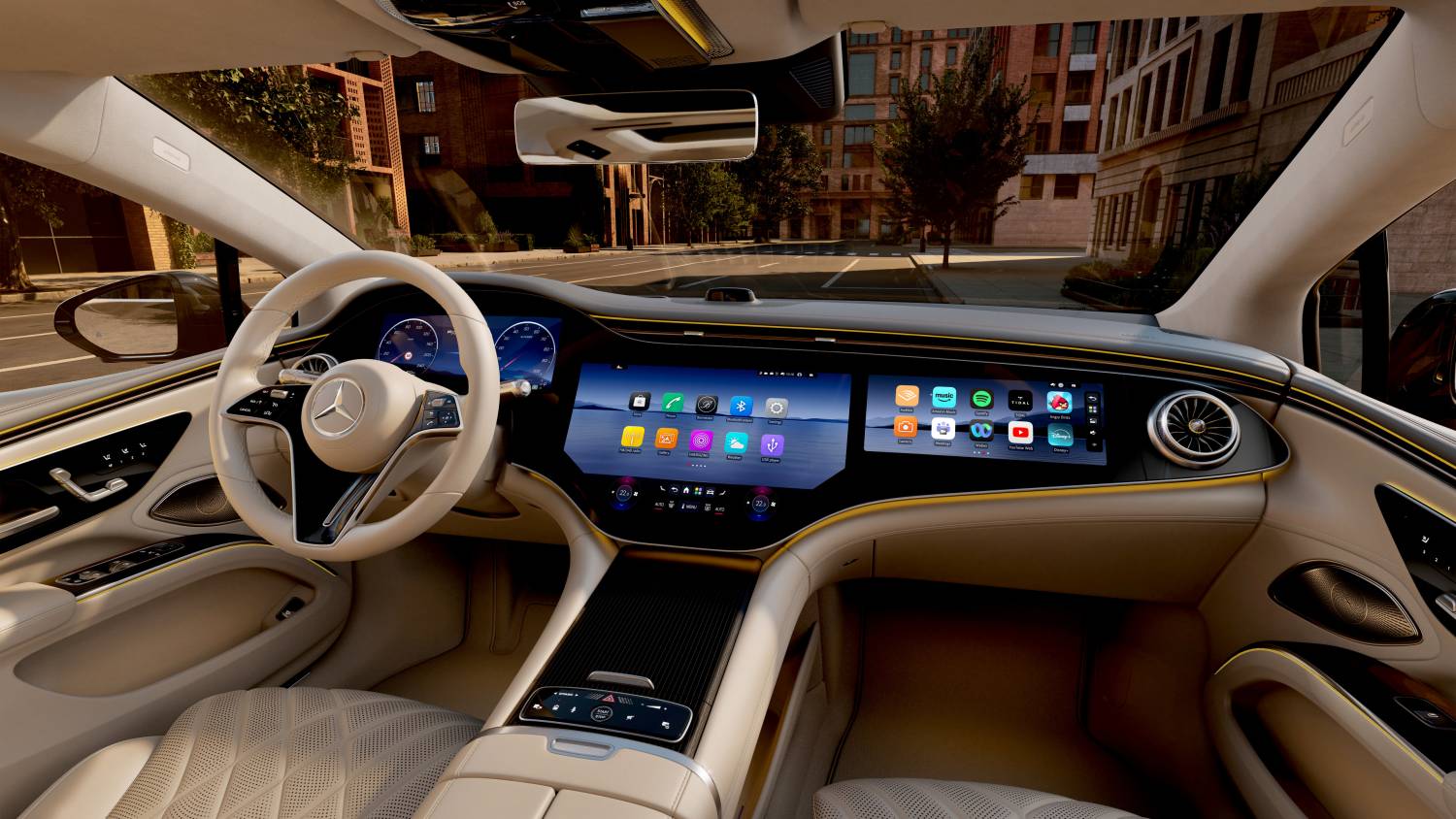 Der weiterentwickelte MBUX Hyperscreen bündelt drei Displays unter einer durchgehenden Glasfläche von über 141 Zentimetern Breite. Ergänzt wird das System durch einen KI-gestützten virtuellen Assistenten, der komplexe Dialoge führen kann. Auch die Navigation wurde weiterentwickelt: Sie berücksichtigt neben Strecke und Verkehr erstmals verstärkt Energieverbrauch, Topografie und Ladeinfrastruktur, um die effizienteste Route zu berechnen.