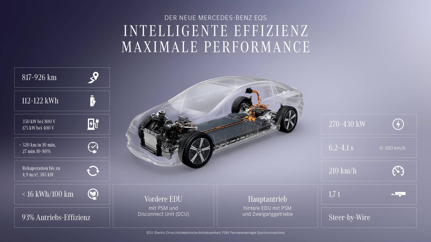 Die überarbeiteten Electric Drive Units (EDU) gelten als kompakter, effizienter und robuster. Ergänzt werden sie durch ein Zweigang-Getriebe an der Hinterachse, das sowohl Beschleunigung als auch Effizienz bei hohen Geschwindigkeiten verbessert. Auch die Rekuperationsleistung wurde deutlich erhöht und liegt nun bei bis zu 385 kW. Im Alltag kann das Fahrzeug damit häufig allein über Energierückgewinnung verzögern. Mit einem cw-Wert ab 0,20 bleibt der EQS eines der aerodynamisch effizientesten Serienfahrzeuge weltweit. Optimierungen an Details wie Außenspiegeln tragen zusätzlich zur Reichweite bei.