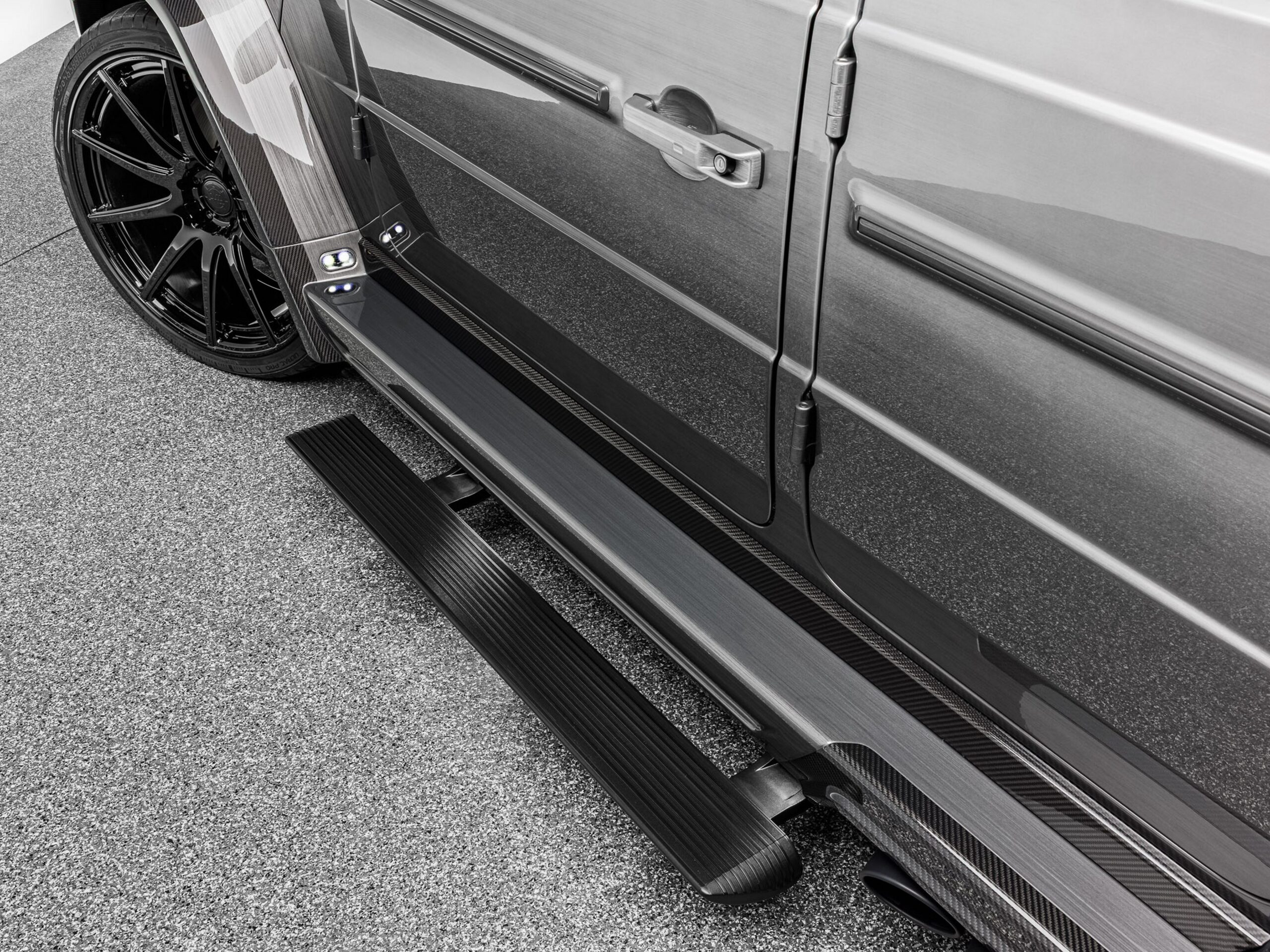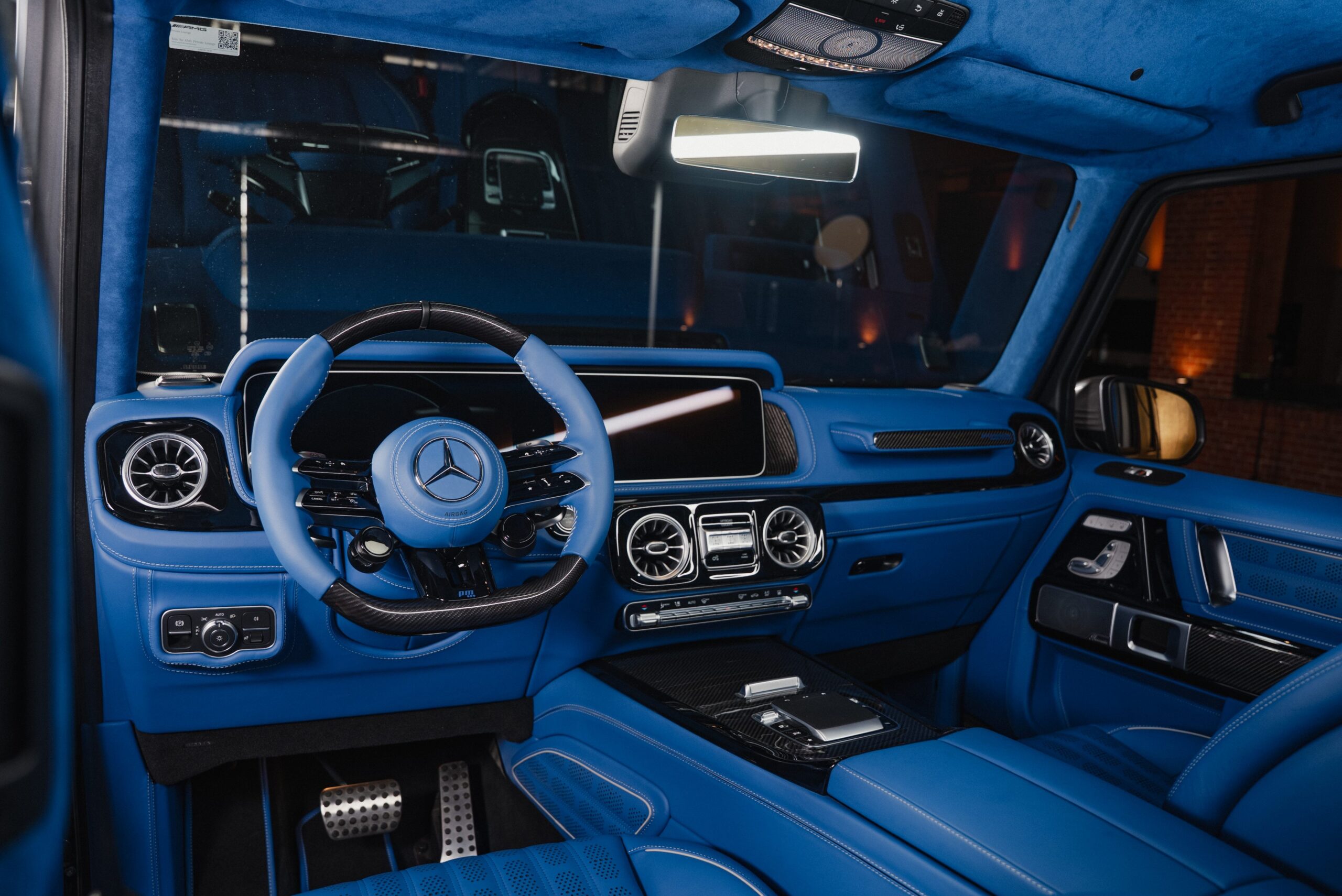 Optisch wird der G805 durch ein vollständig integriertes Carbon Wide Body Kit geprägt, das die Spur um 10 Zentimeter verbreitert. Ergänzt wird die Architektur durch 24-Zoll-Schmiedefelgen und eine neu gestaltete Front mit One-by-One-Grill. Die Abgasanlage ist dezent integriert, akustisch jedoch klar präsent – ein tief abgestimmter AMG-Klang, der die technische Seite des Fahrzeugs unterstreicht.