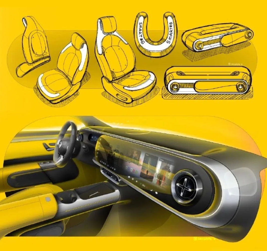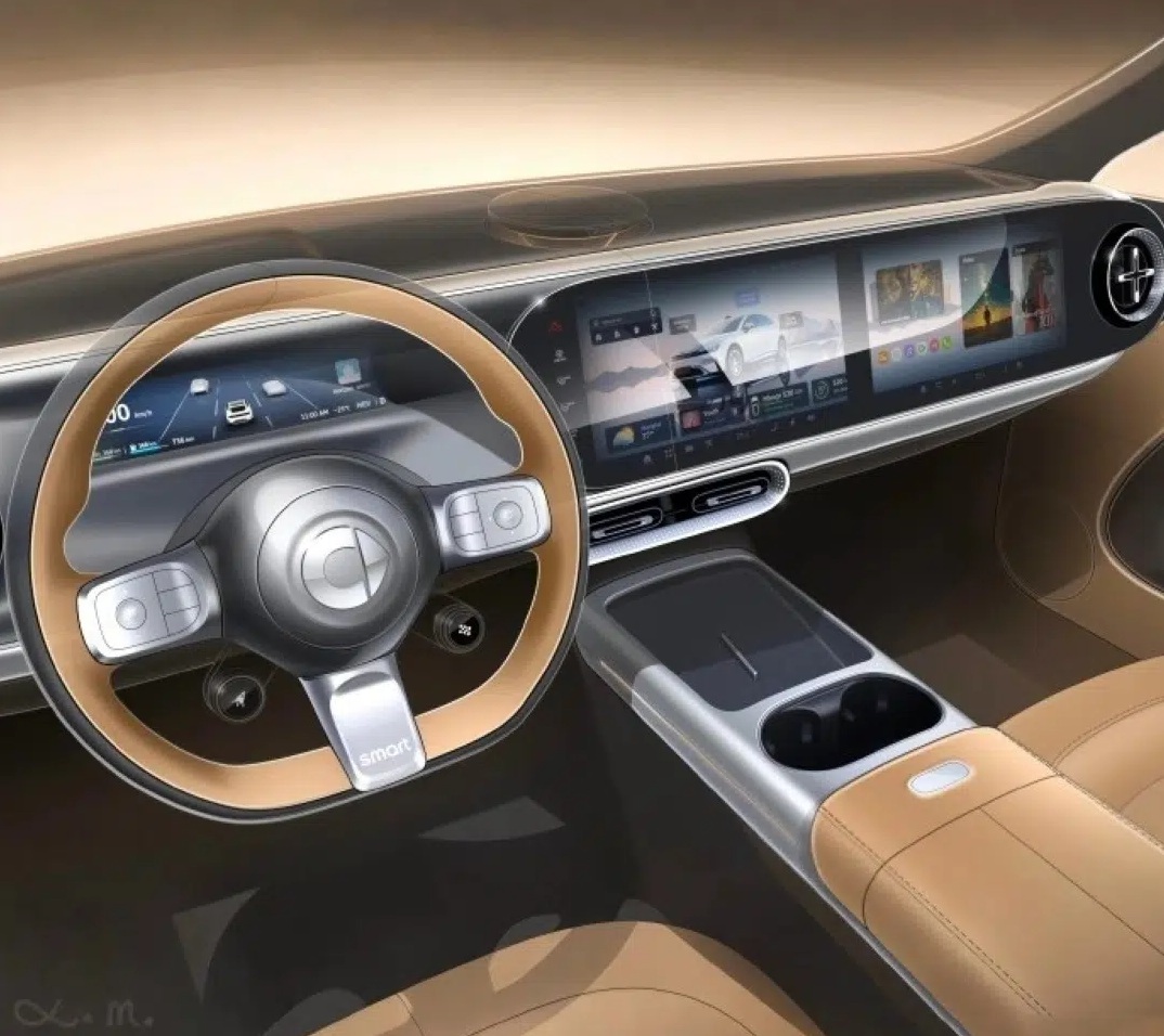 Schon auf den ersten Blick wird deutlich, dass smart den Innenraum wie das smart #5 Modell gestaltet. Im Zentrum steht auch hier ein breit angelegtes Armaturenbrett, das durch klare Linien und hochwertige Oberflächen strukturiert wird. Besonders auffällig sind erneut die turbinenförmigen Lüftungsdüsen Wie auch im #5 Modell ist das Higlight ein ausfahrbarer Lautsprecher im Armaturenbrett, das beim Aktivieren des Systems sichbar wird und womit smart auch das Premium-Gefühl steigern möchte. Ergänzt wird das Interieur u.a. durch eine dezente Ambientebeleuchtung, die besonders die Linien und Formen betonen und unterschiedliche Stimmungen erzeigt.